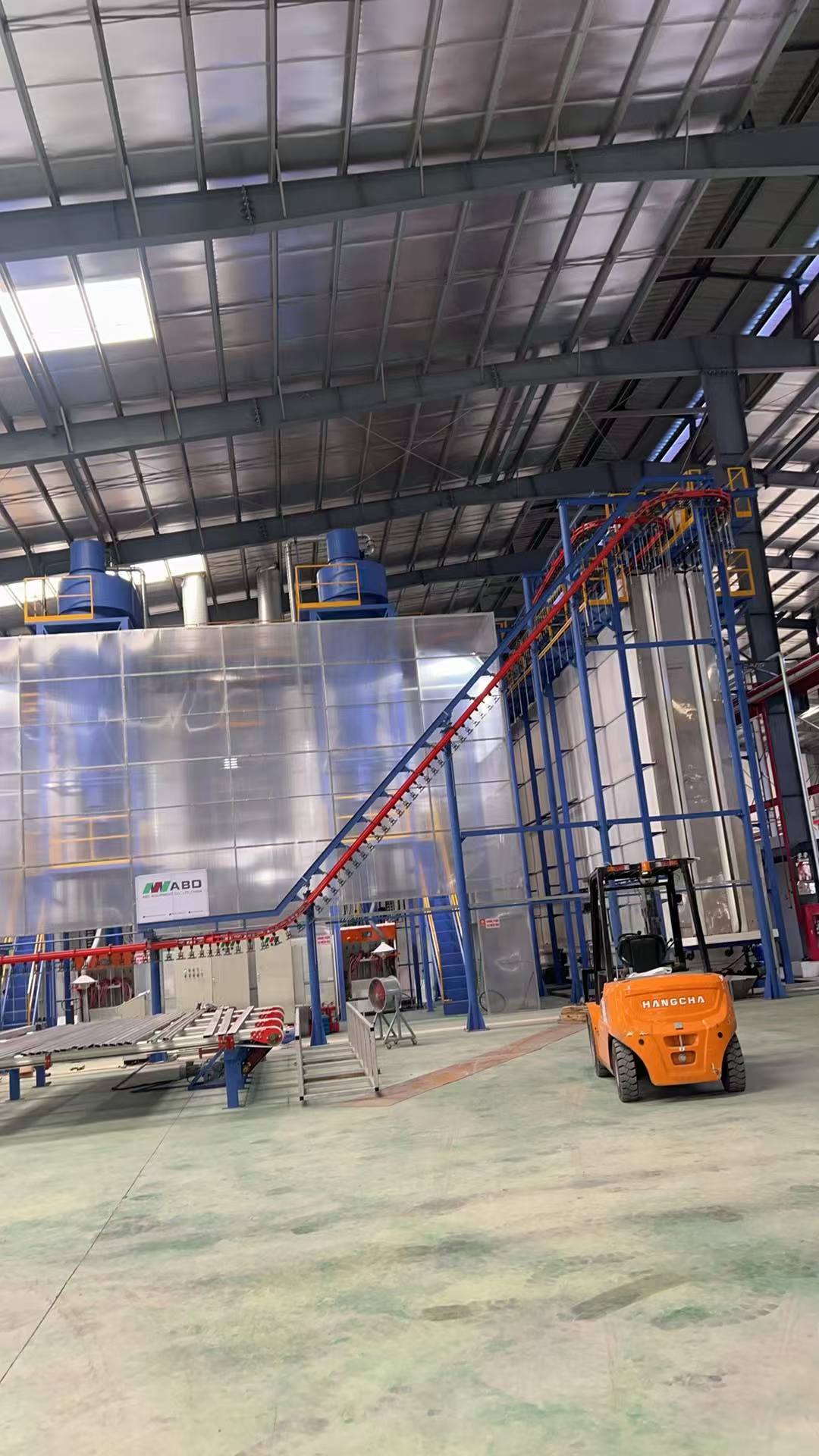 Κύριο συστατικό:Σύστημα κρεμαστού μεταφορέα επίστρωσης σκόνης, σύστημα φόρτωσης και εκφόρτωσης, προεπεξεργασία, φούρνος ξήρανσης, θάλαμος επίστρωσης σκόνης και σύστημα ανακύκλωσης, φούρνος ωρίμανσης, ηλεκτρικό σύστημα ελέγχου, πιστόλια επίστρωσης σκόνης, κέντρο παροχής σκόνης, αεροσυμπιεστής, σύστημα μηχανής νερού DI και ούτω καθεξής.